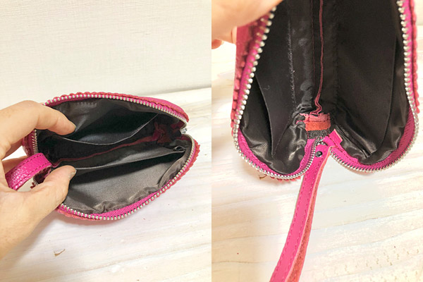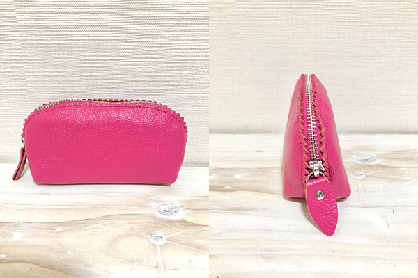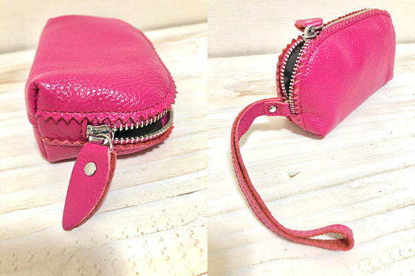 ピンキングカットの縁取りがキュートな本革ポーチです。