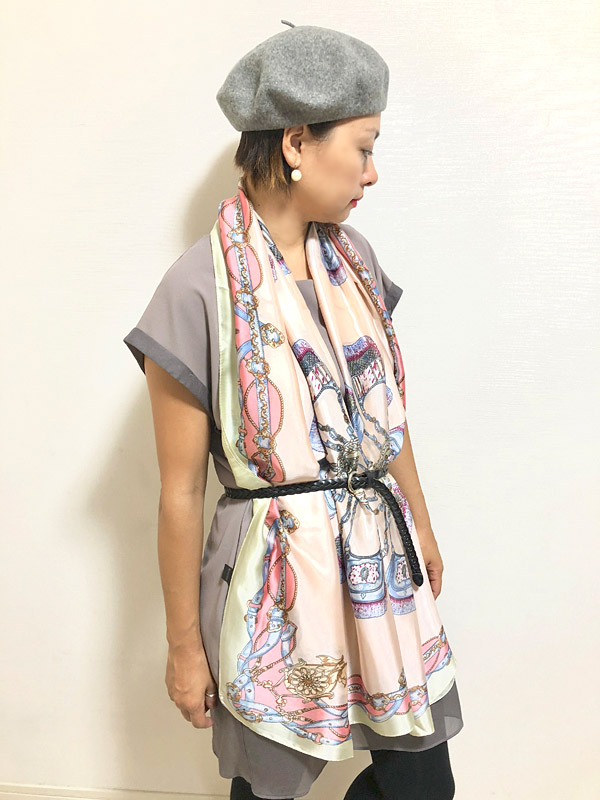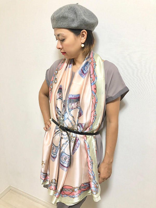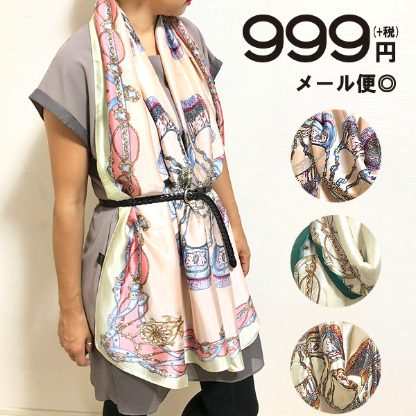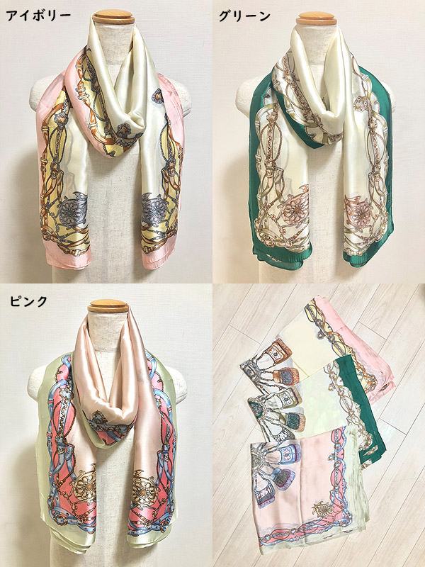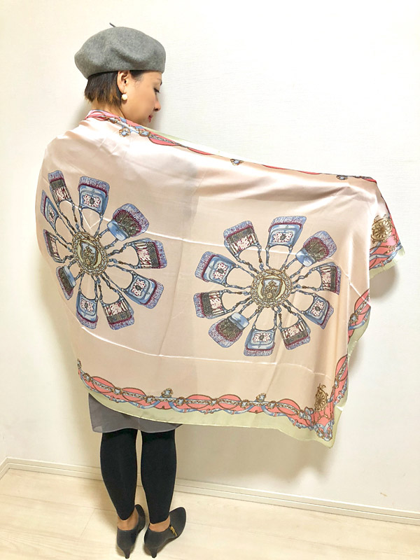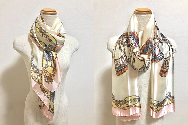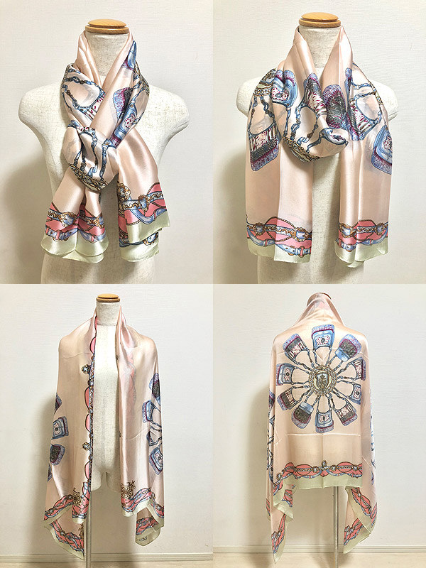 入荷待ち続出の大好評シルキータッチストールシリーズに新作デザインが仲間入りです☆☆☆クラシカルなバッグやベルトなどレザーアイテムをプリントしたヨーロピアンで洗練されたデザイン。